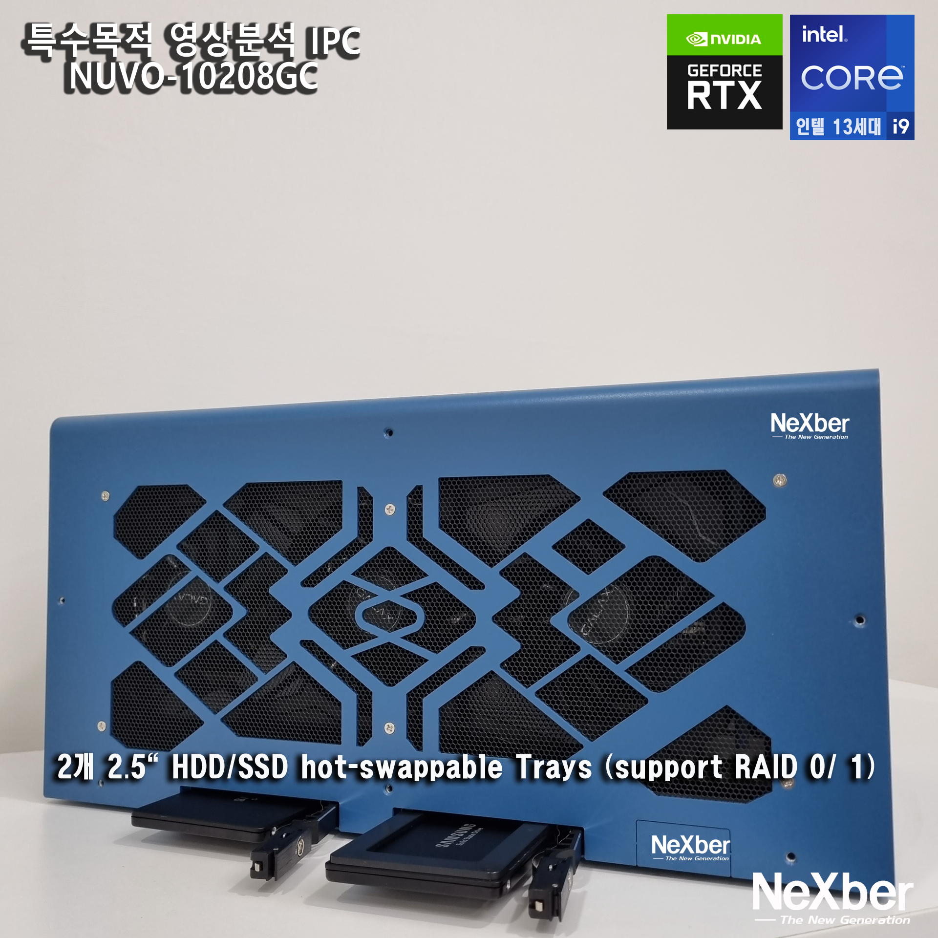 1개 M.2 NVMe 슬롯, 2개 2.5인치 SATA 외부 트레이 and 1개의 NVMe 외부 트레이 (옵션)
